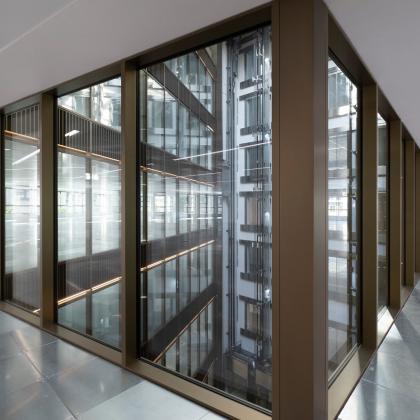 Elsewhere, Vision Arch provided curtain walling to the internal atrium rising from the bottom of the upper ground floor to the top of the seventh floor. The full height atrium lift columns and sides were cladded with metal cladding / spandrel panels complete with a bronze finish and integrated LED strip lighting.