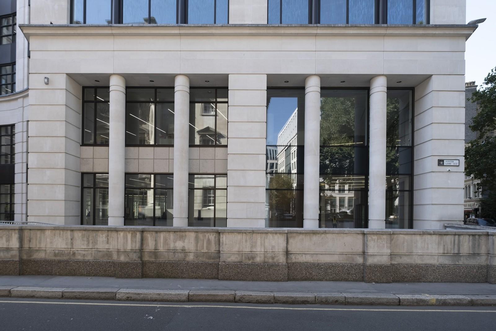 The final elevation on Foster Lane provided with a new existing glazing / curtain walling with new concealed frame glazing design on the upper ground to first floor.