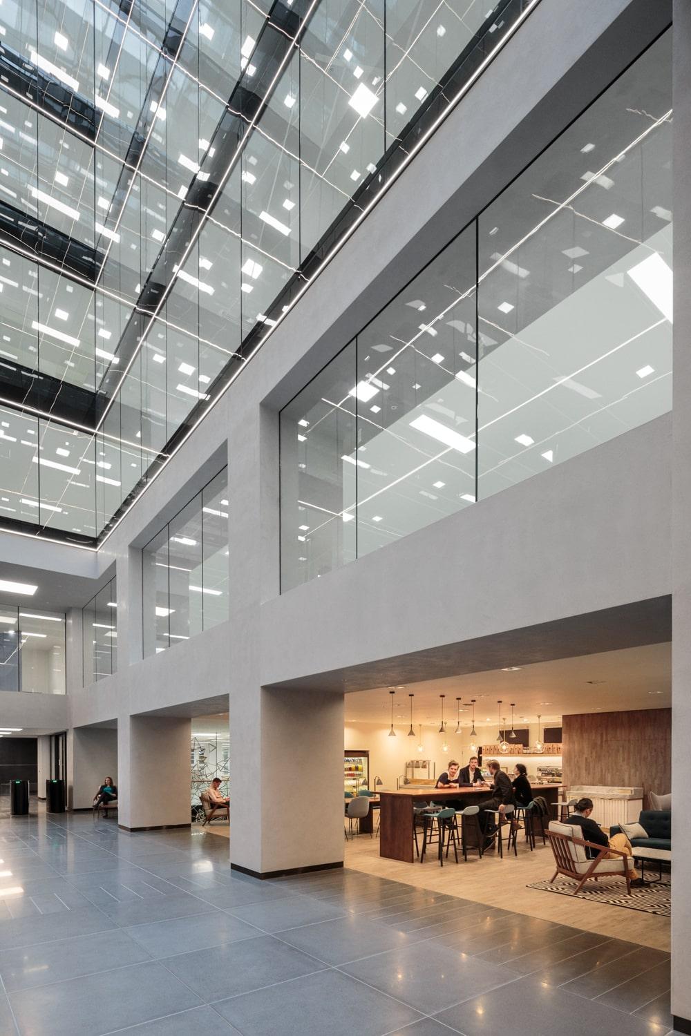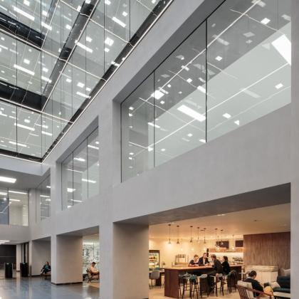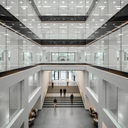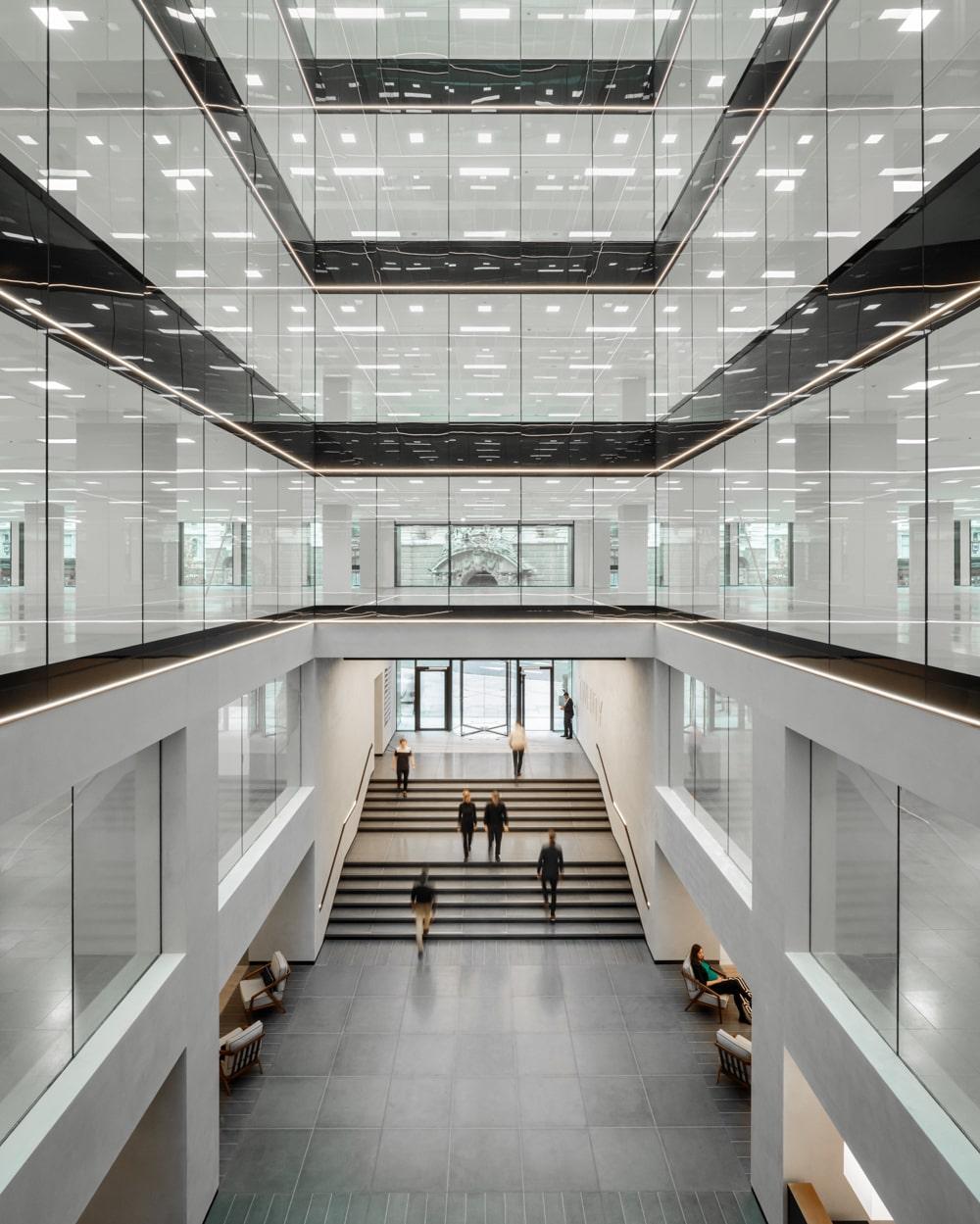 The glazed atrium, rising the entire height of the 9-storey building, brings natural light deep into the plan of the office floors, perfectly illuminating the lower ground floor.