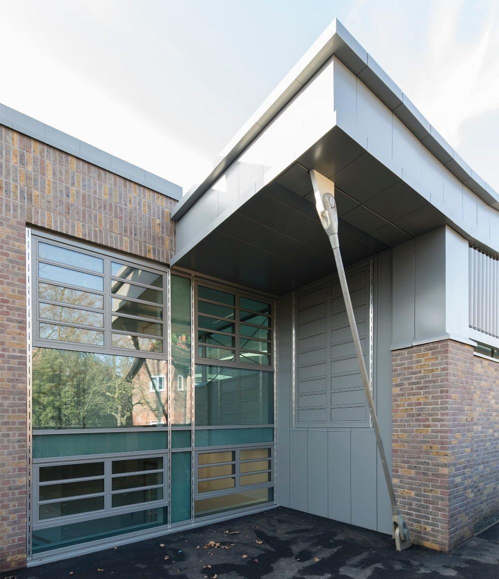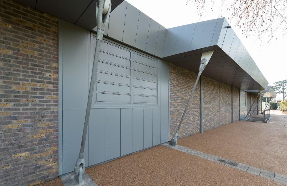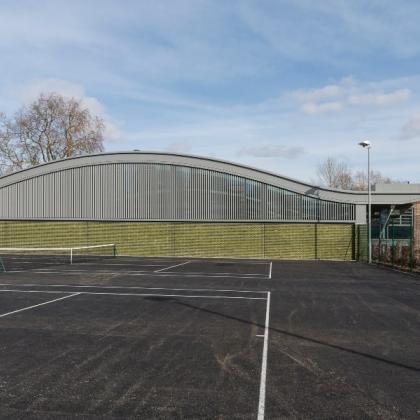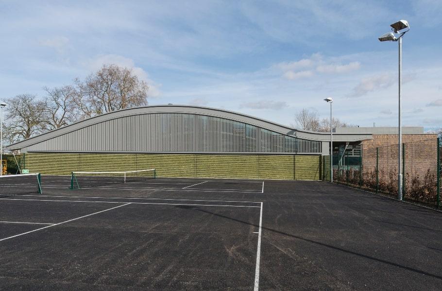 Multi-material facade, covering all elevations of the Racquet Centre with rooflights nestled within the sedum grass roof; ensuring both players and guests enjoy an enhanced sporting experience.
