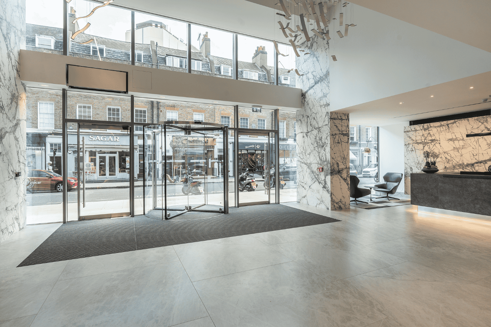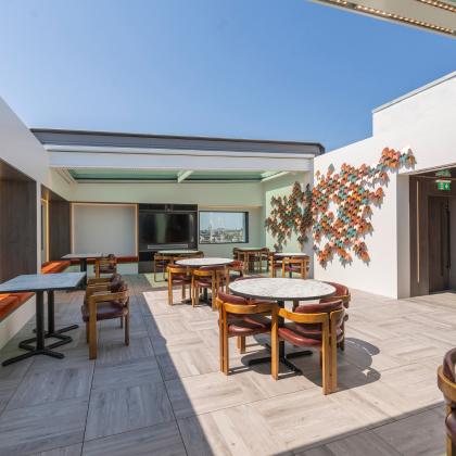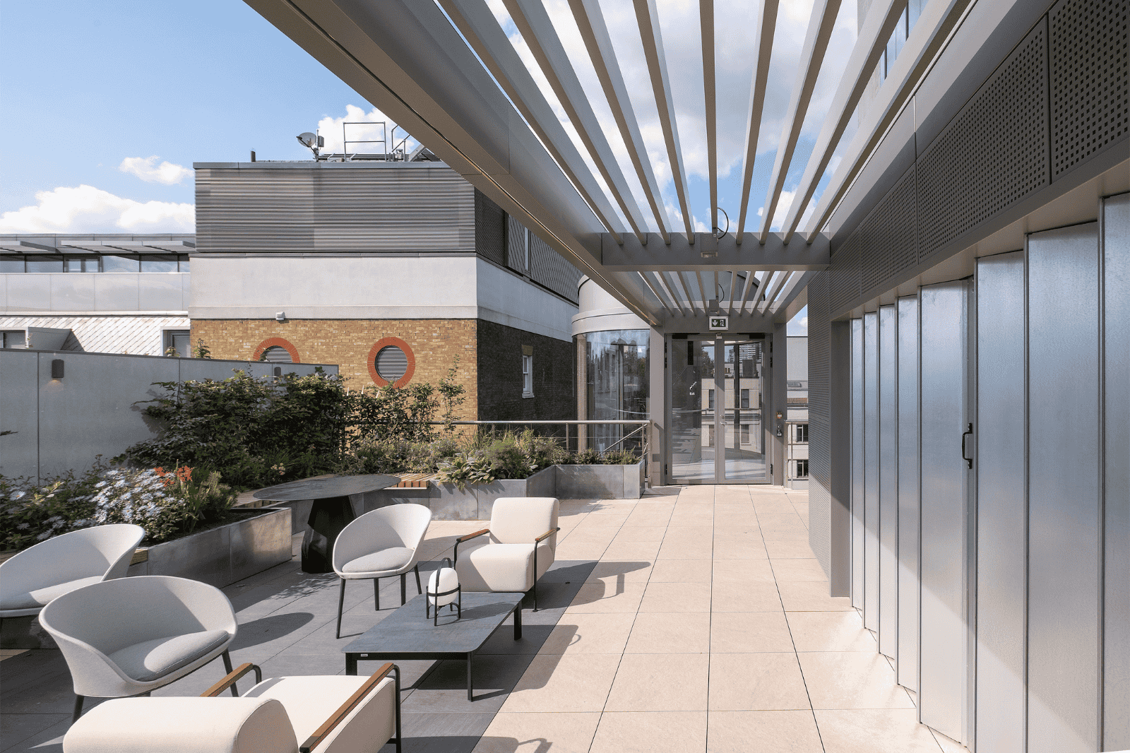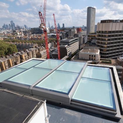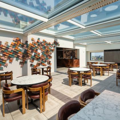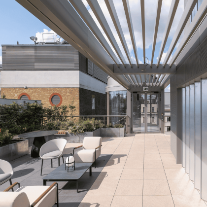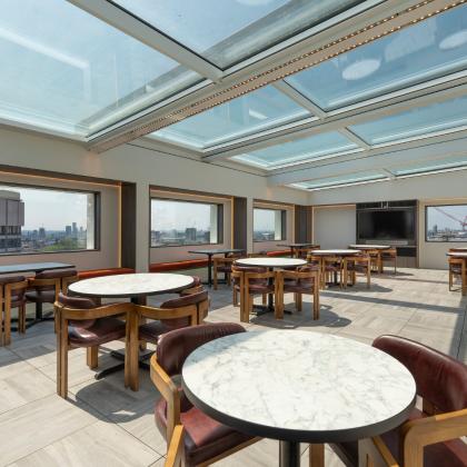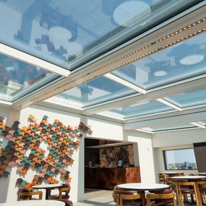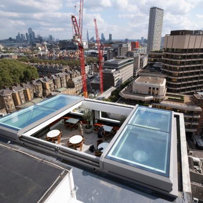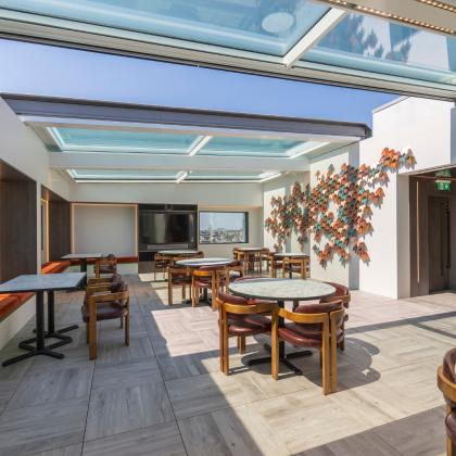 The motorised rooflight over the “The Met Lounge” allows the space to serve multiple purposes, such as a café, events venue, and yoga studio. Located beneath the sliding glass roof panels, it allows natural light to flood in, and offers breath-taking views of southern London through the existing rectangular openings, which act like frames, beautifully framing the scenic views and enhancing the overall aesthetic appeal of the space.