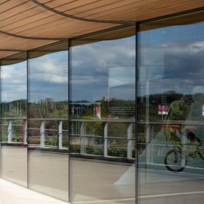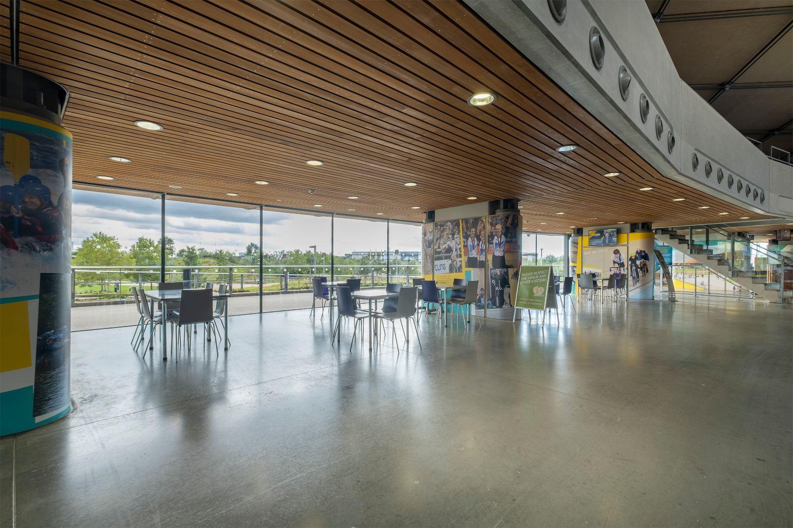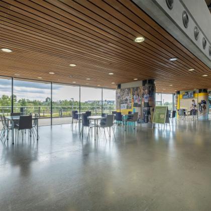 The concourse is fully glazed to allow views both into and out of the building. It also helps to visually separate the Western Red Cedar clad upper bowl from the ground floor back of house accommodation, which is largely hidden behind the landscaped earth berms that form a visual plinth at the east and west ends of the building.