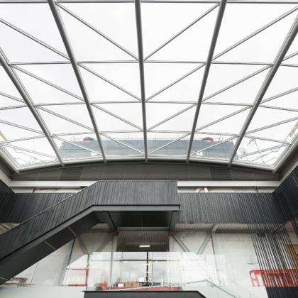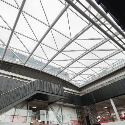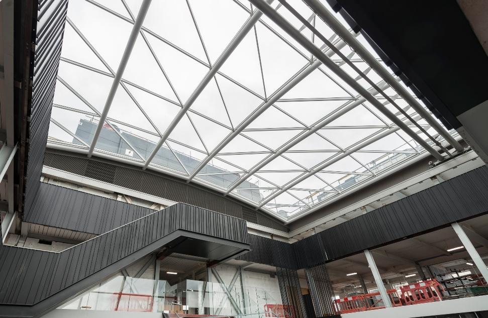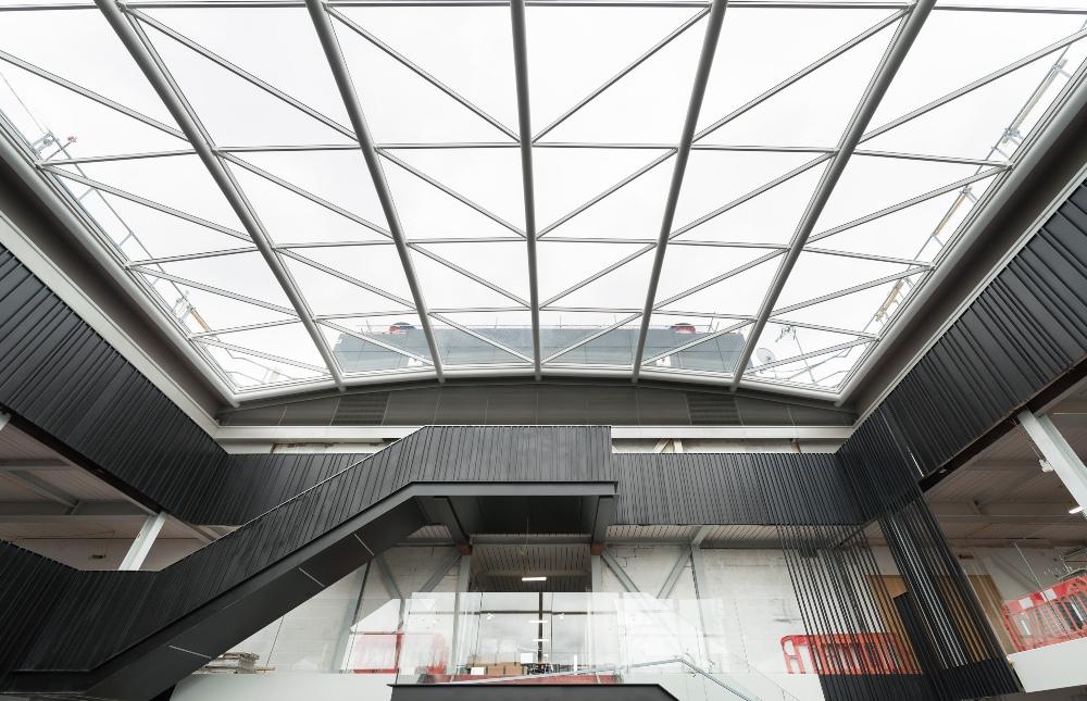 Vision Arch were appointed by ISG to carry out the removal of existing ETFE roof, then design, supply and installation of a new 60 panel grid shell roof utilising the existing secondary steelwork.