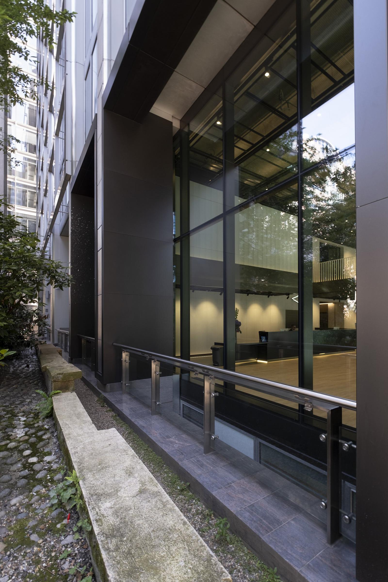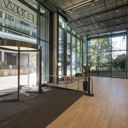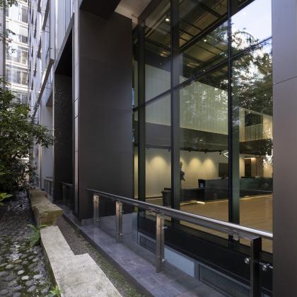 The entrance was made accessible by frameless swing doors (manual and automatic) and a tri-wing Boon Edam revolving door.